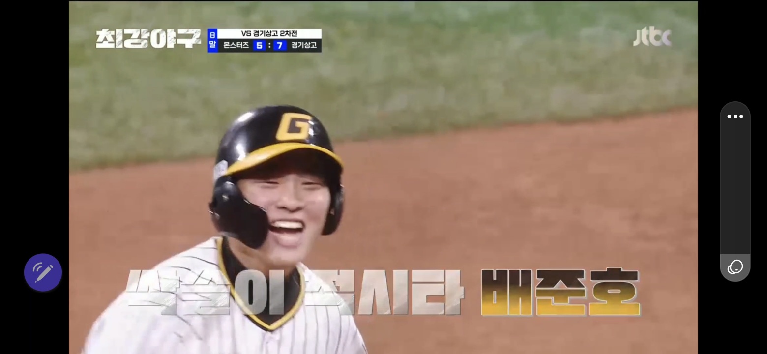 그리고 배준호가 안타를 쳐냈습니다! 역전이다! 1루주자도 홈까지 들어오며 5:7로 점수 추가! 싹쓸이 적시타!